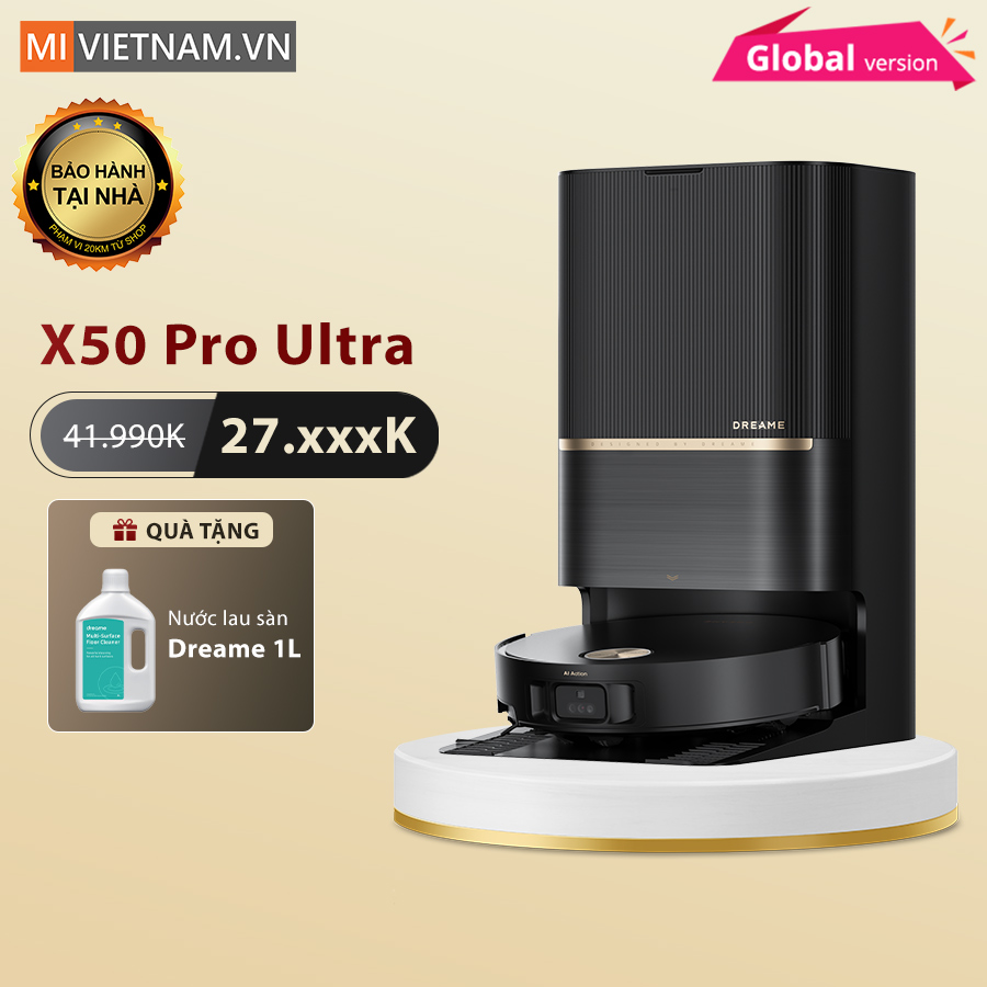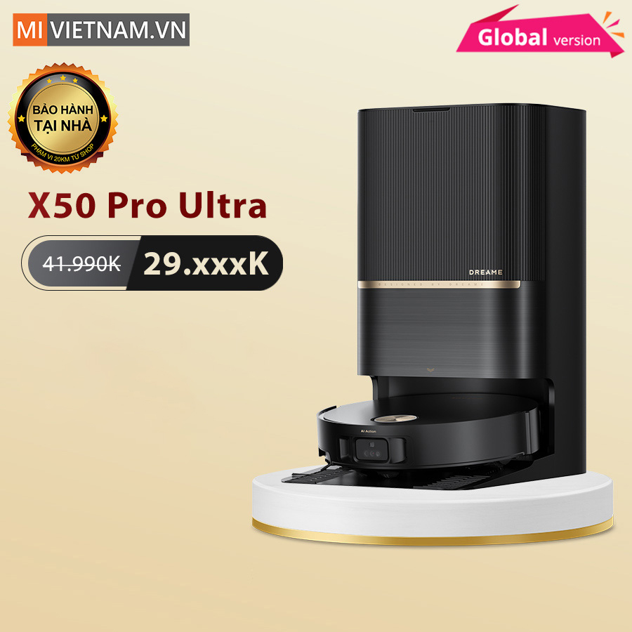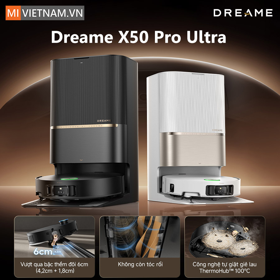 Robot hút bụi lau nhà Dreame X50 Pro Ultra đánh dấu bước đột phá mới trong công nghệ làm sạch thông minh. Trang bị chân nâng tự động ProLeap™ độc quyền, robot có thể linh hoạt vượt chướng ngại vật cao tới 6cm, dễ dàng di chuyển qua thảm, sàn và các bậc cửa. Hệ thống ThermoHub™ hiện đại cho phép tự giặt giẻ bằng nước nóng 100°C, loại bỏ hoàn toàn vi khuẩn và dầu mỡ. Sức hút mạnh mẽ 30.000 Pa Vormax™ bảo đảm làm sạch sâu từ bụi mịn đến lông thú cưng, hỗ trợ thêm bởi hệ thống HyperStream™ DuoBrush chống rối hiệu quả. Dreame X50 Pro Ultra còn sở hữu công nghệ lau nước ấm 40°C cùng Dual Flex Arm làm sạch sát chân tường, mang đến trải nghiệm vệ sinh toàn diện.