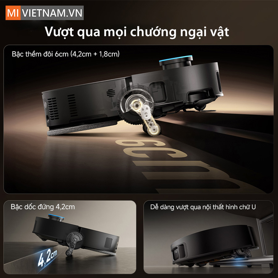 Với khả năng vượt qua bậc cao kép (4.2 cm + 1.8 cm) hay bậc thẳng đứng 4.2 cm, Dreame X50 Pro Ultra mang lại độ tin cậy khi hoạt động, giúp robot di chuyển liền mạch giữa các khu vực mà không bị kẹt hay gián đoạn.