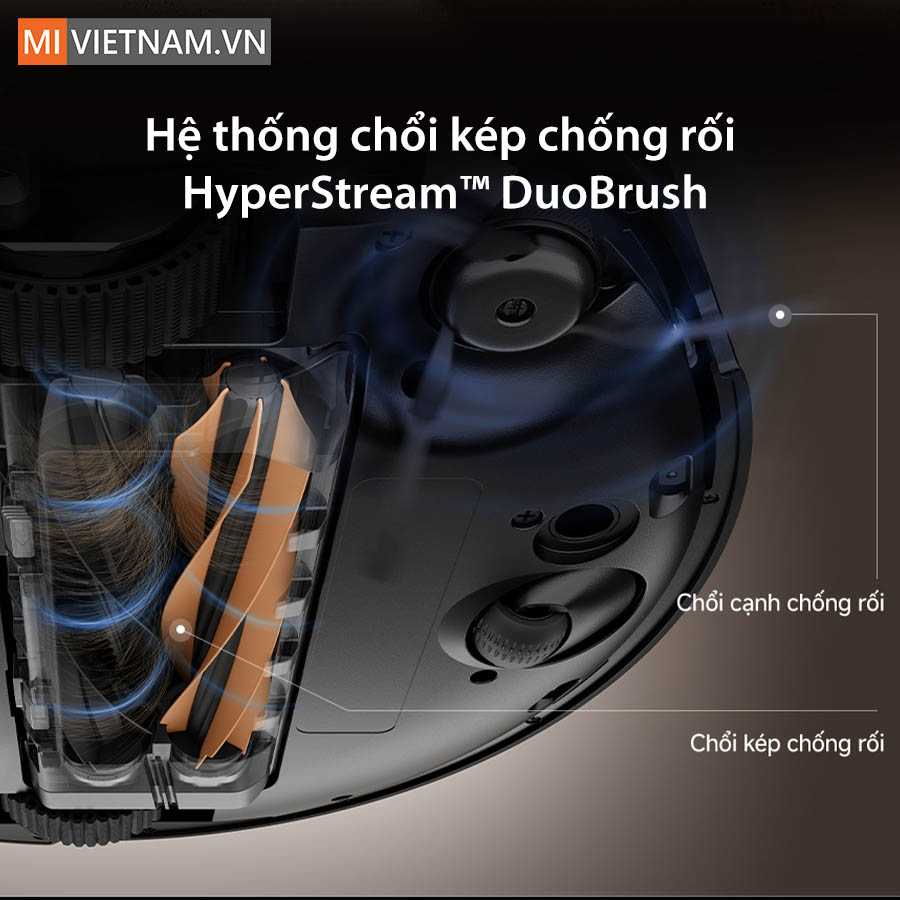 Cấu trúc chổi kép chống rối của hệ thống HyperStream™ DuoBrush gồm một chổi cao su TPU chuyên dụng cho thảm và một chổi lông mềm dành cho sàn cứng, phối hợp cùng lực hút mạnh để xử lý triệt để tóc dài tới 30cm mà không gây tiếng ồn lớn.