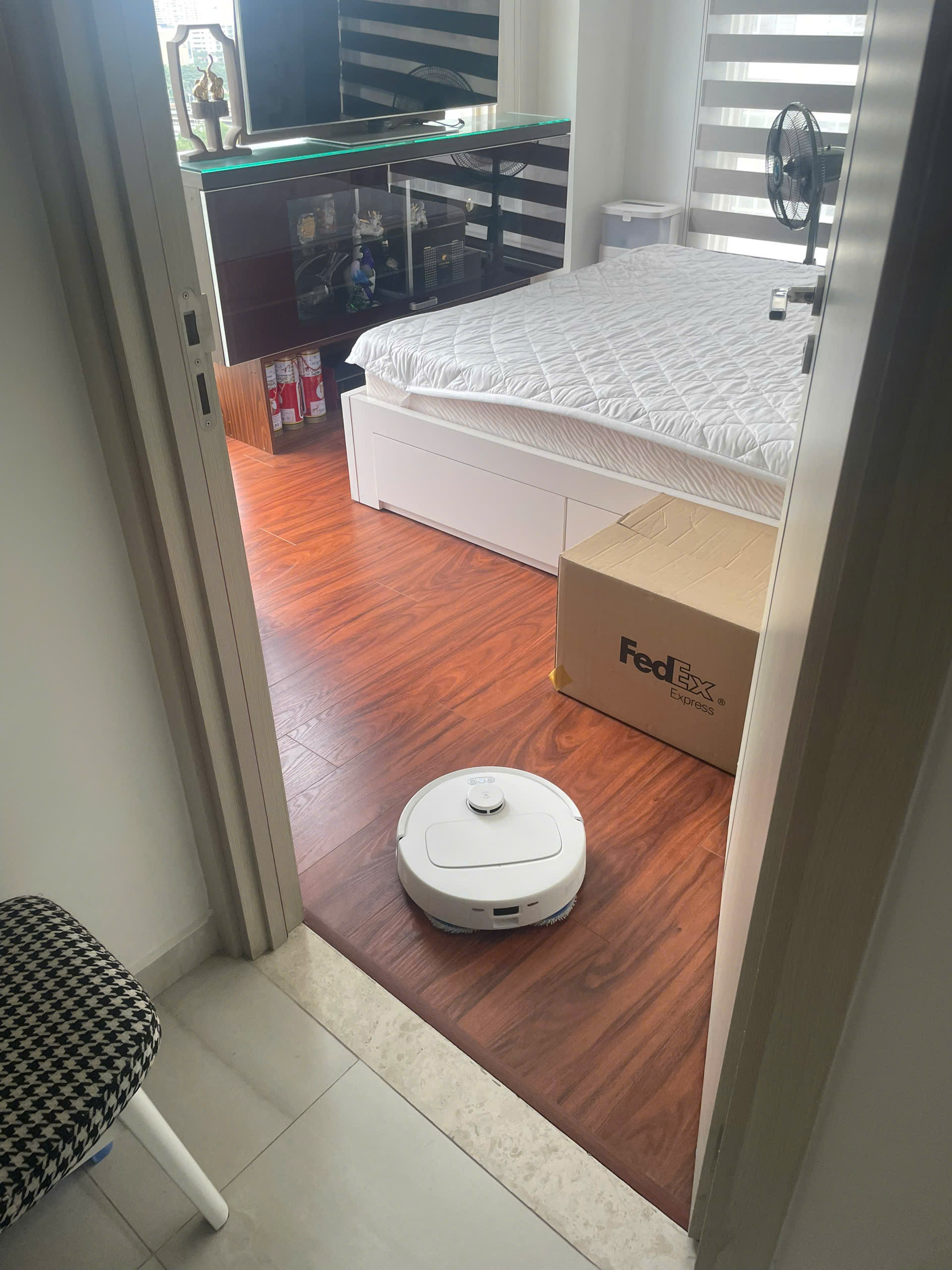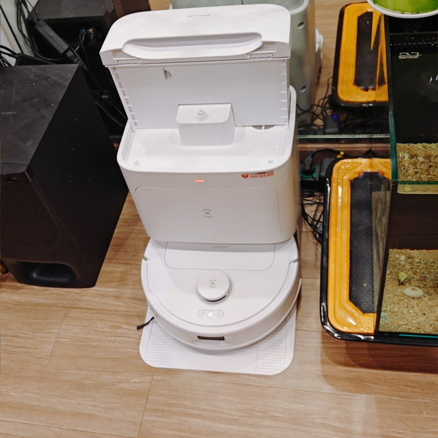Phòng khách nhà mình khá rộng mà con robot này hút sạch tinh, dock sạc nhiều tính năng chung quy không cần đụng tay vào việc gì