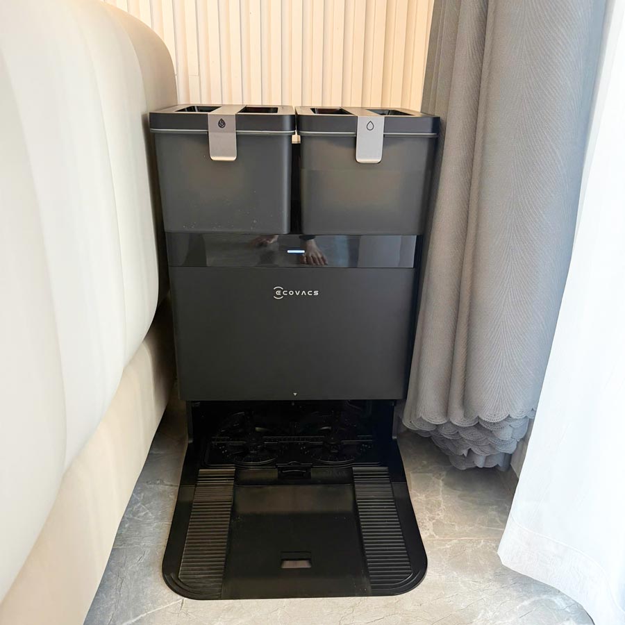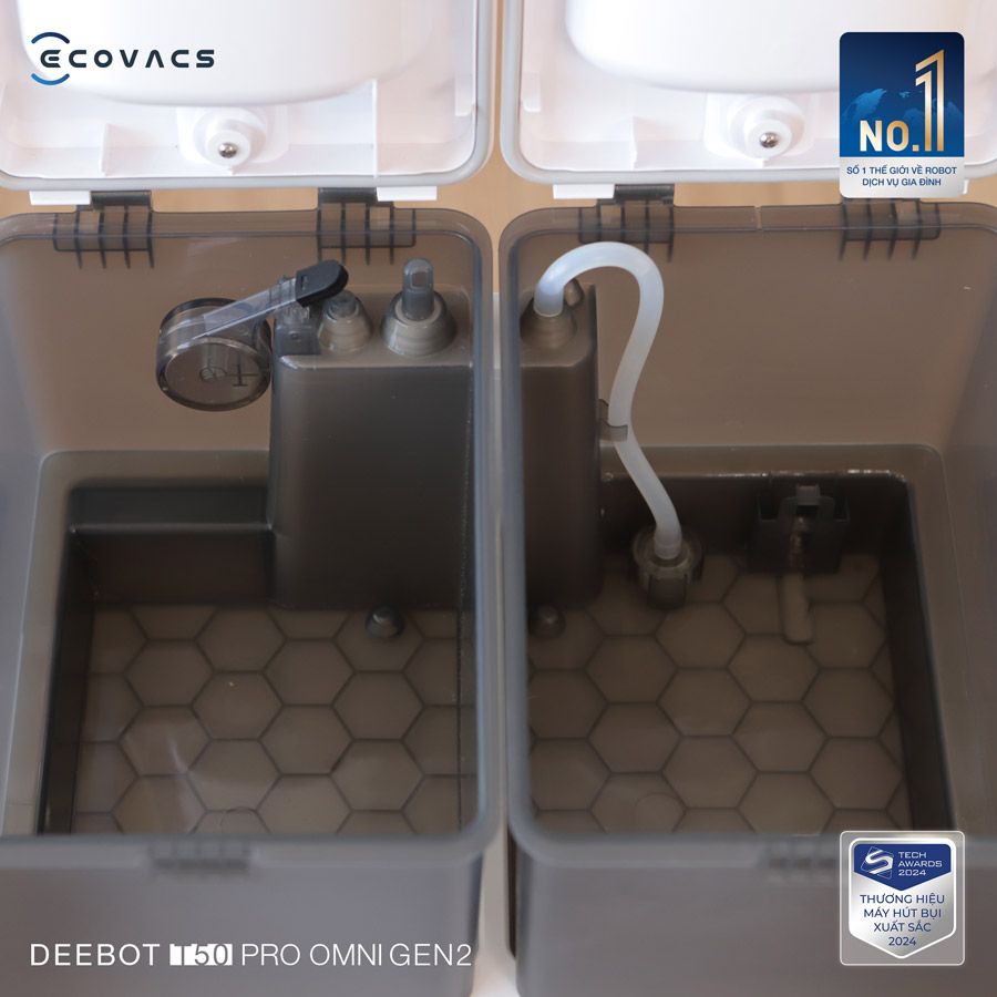 • Quản lý nước thông minh: Với hai bình nước sạch/bẩn dung tích lớn 4L, trạm tự động bơm nước vào bình chứa 55ml của robot, hỗ trợ làm sạch diện tích lên tới 300m².