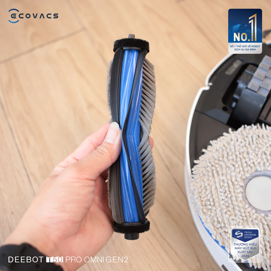 Đối với những gia đình có thành viên tóc dài hoặc nuôi thú cưng rụng lông, việc gỡ rối chổi chính là một cực hình. Hệ thống ZeroTangle 2.0 trên Deebot T50 Pro Omni Gen 2 được thiết kế với luồng khí động học và cấu trúc chổi V-Shape đặc biệt để hạn chế tối đa tình trạng tóc quấn chặt vào trục.