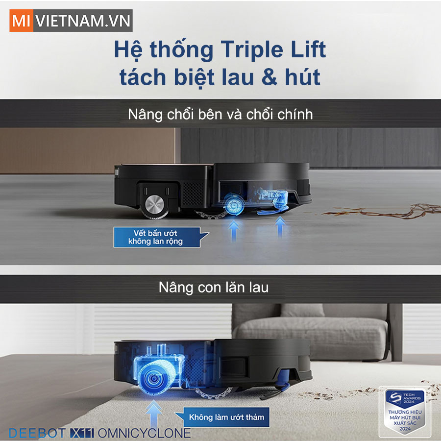 Hệ thống Triple Lift là một trong những cải tiến đột phá của Ecovacs X11 Omni Cyclone, cho phép robot linh hoạt xử lý từng tình huống làm sạch: