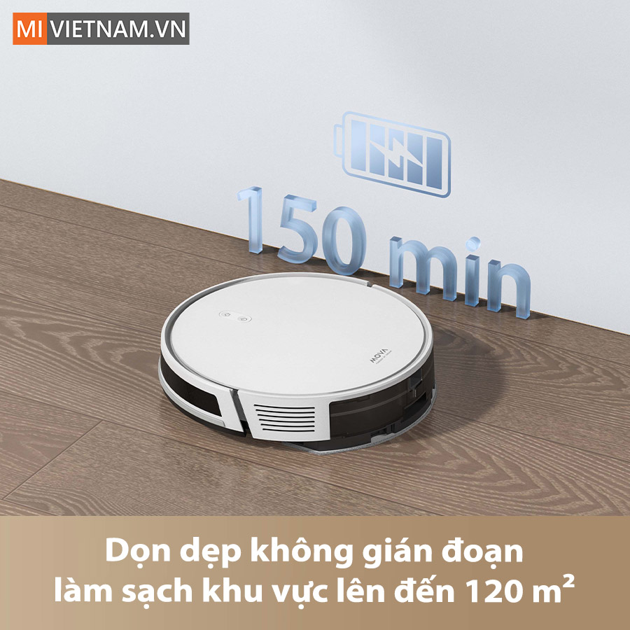 Robot được trang bị pin 2.600 mAh cho thời gian hoạt động lên đến 150 phút, đáp ứng diện tích làm sạch khoảng 120 m² chỉ trong một lần sạc. Khi pin yếu, thiết bị sẽ tự động quay về đế sạc để đảm bảo quá trình vận hành liền mạch.