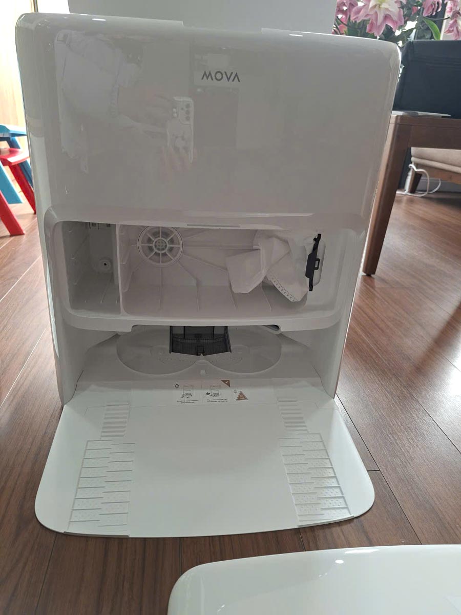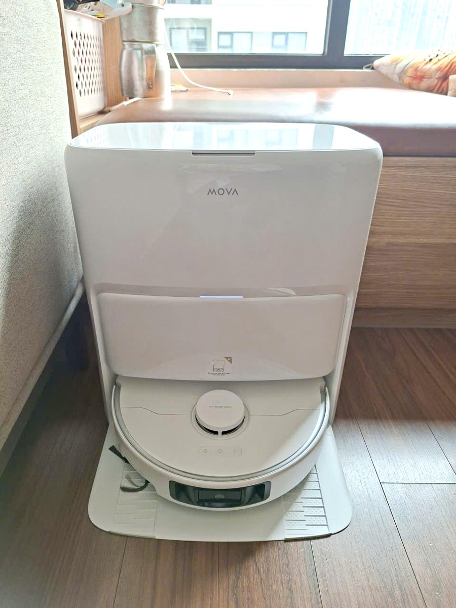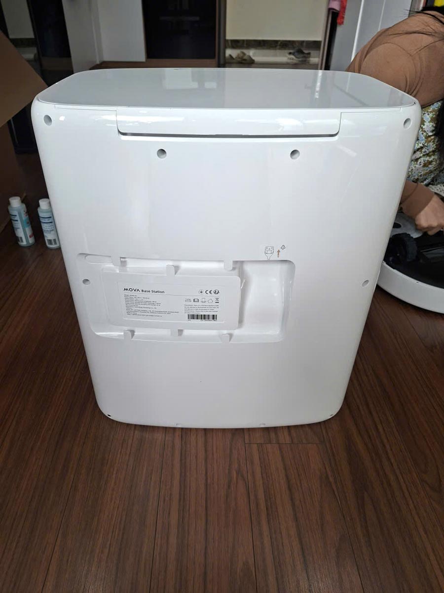 Dock sạc của Mova P50 Ultra tích hợp hàng loạt tính năng thông minh: tự động hút bụi, giặt khăn lau bằng nước nóng 75°C, sấy khô bằng khí nóng 45°C, tự động cấp nước cho bình chứa và hỗ trợ thêm nước lau sàn (cần mua bình dung dịch chuyên dụng). Nhờ hệ thống 20 vòi phun, nước được phân bổ đều lên khăn lau, giúp làm sạch ván giặt hiệu quả và hạn chế tồn dư nước bẩn.