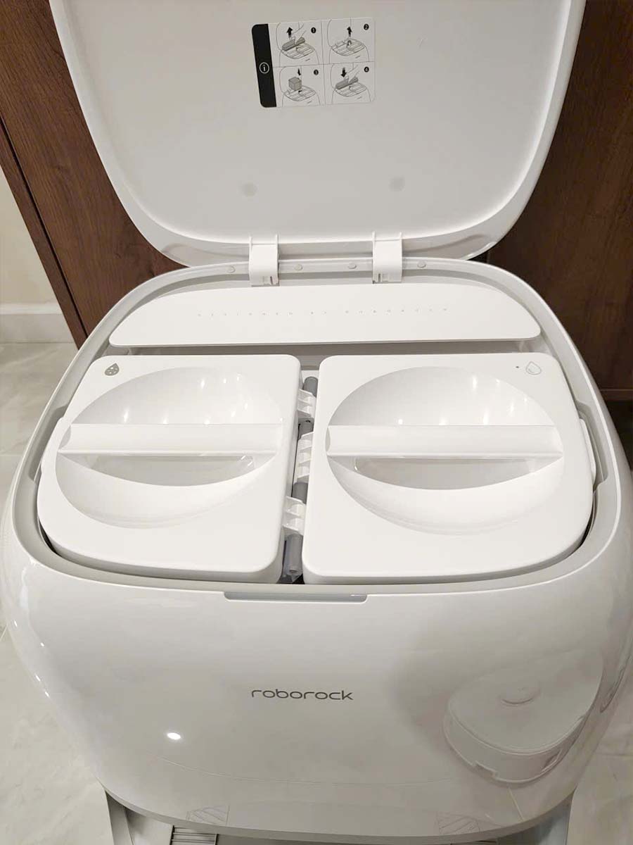 Trạm sạc của Roborock Qrevo Curv 2 Flow sở hữu thiết kế khay giặt cải tiến, cho phép phân tách rõ ràng nước sạch và nước bẩn, loại bỏ hoàn toàn nguy cơ tái nhiễm trong quá trình vệ sinh.