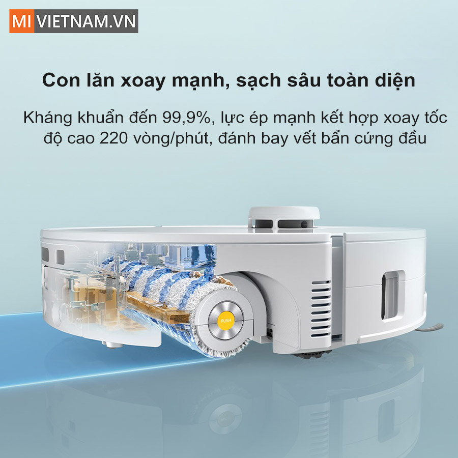 - Chổi cạnh và con lăn kéo dài: Tăng bán kính quét dọn, đưa bụi và rác sát tường vào vùng hút và lau.