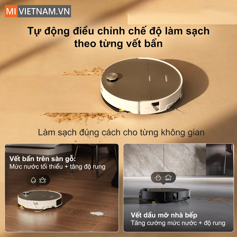 • Tùy biến từng khu vực: Bạn có thể cài đặt lượng nước thấp cho sàn gỗ để bảo vệ sàn, hoặc tăng cường độ rung và nước cho khu vực bếp nhiều dầu mỡ.