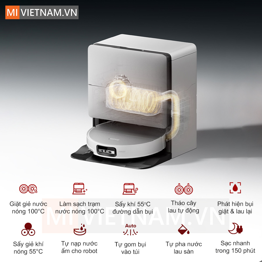 Cơ chế tự làm sạch đế sạc: Module làm sạch sẽ tự động cọ rửa và đẩy cặn bẩn xuống khay chứa nước thải, giúp giảm thiểu tối đa tần suất người dùng phải vệ sinh thủ công trạm sạc.