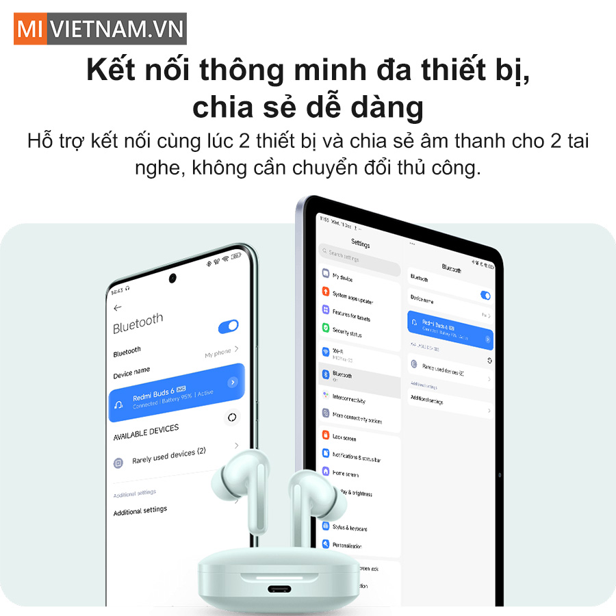 - Kết nối và quản lý thông minh qua ứng dụng Xiaomi Earbuds, hỗ trợ chia sẻ âm thanh